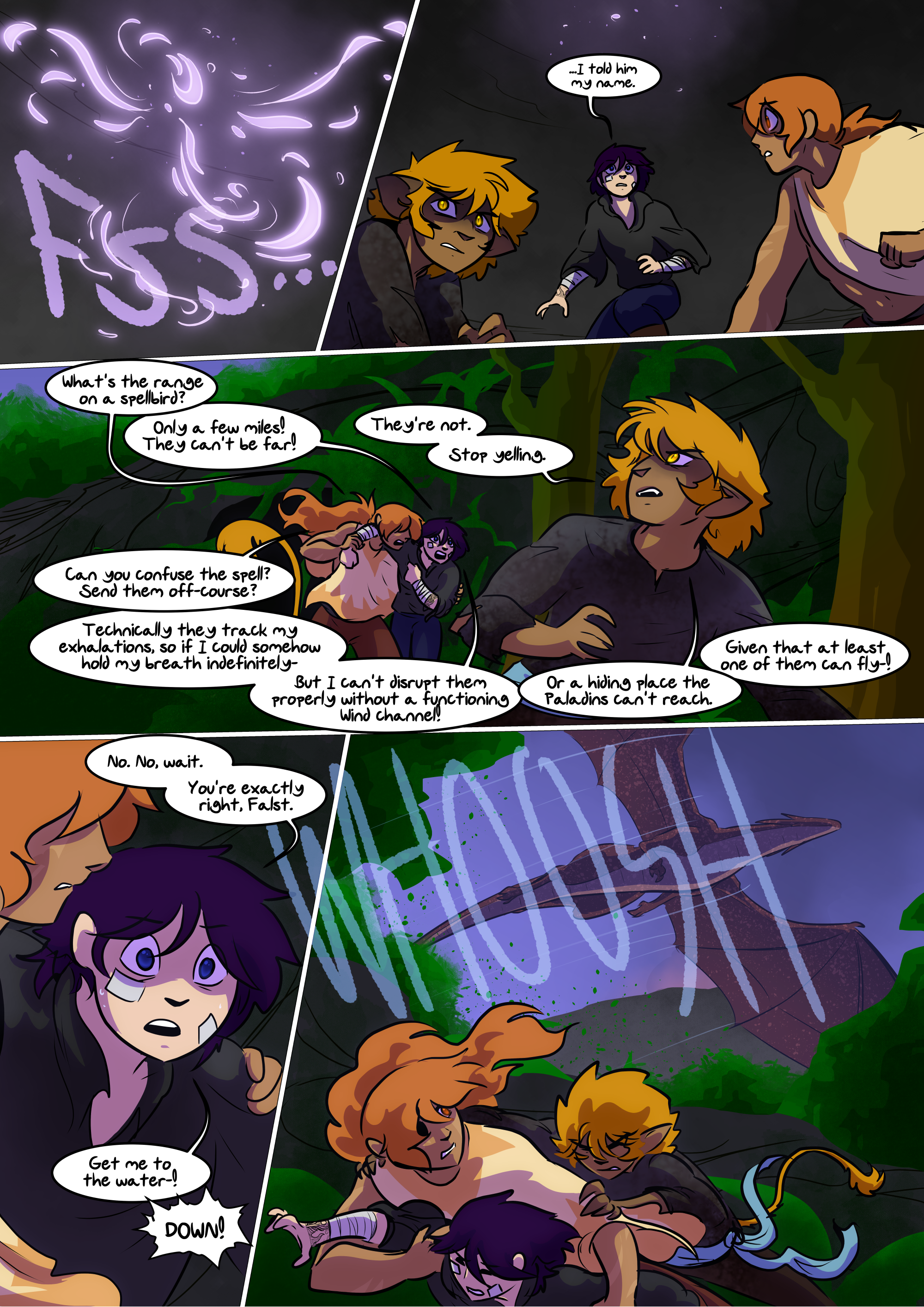 . “Given that at least one of them can fly–! No,” Erin says, realizing something. “No, wait. You’re exactly right, Falst. Get me to the water–!”