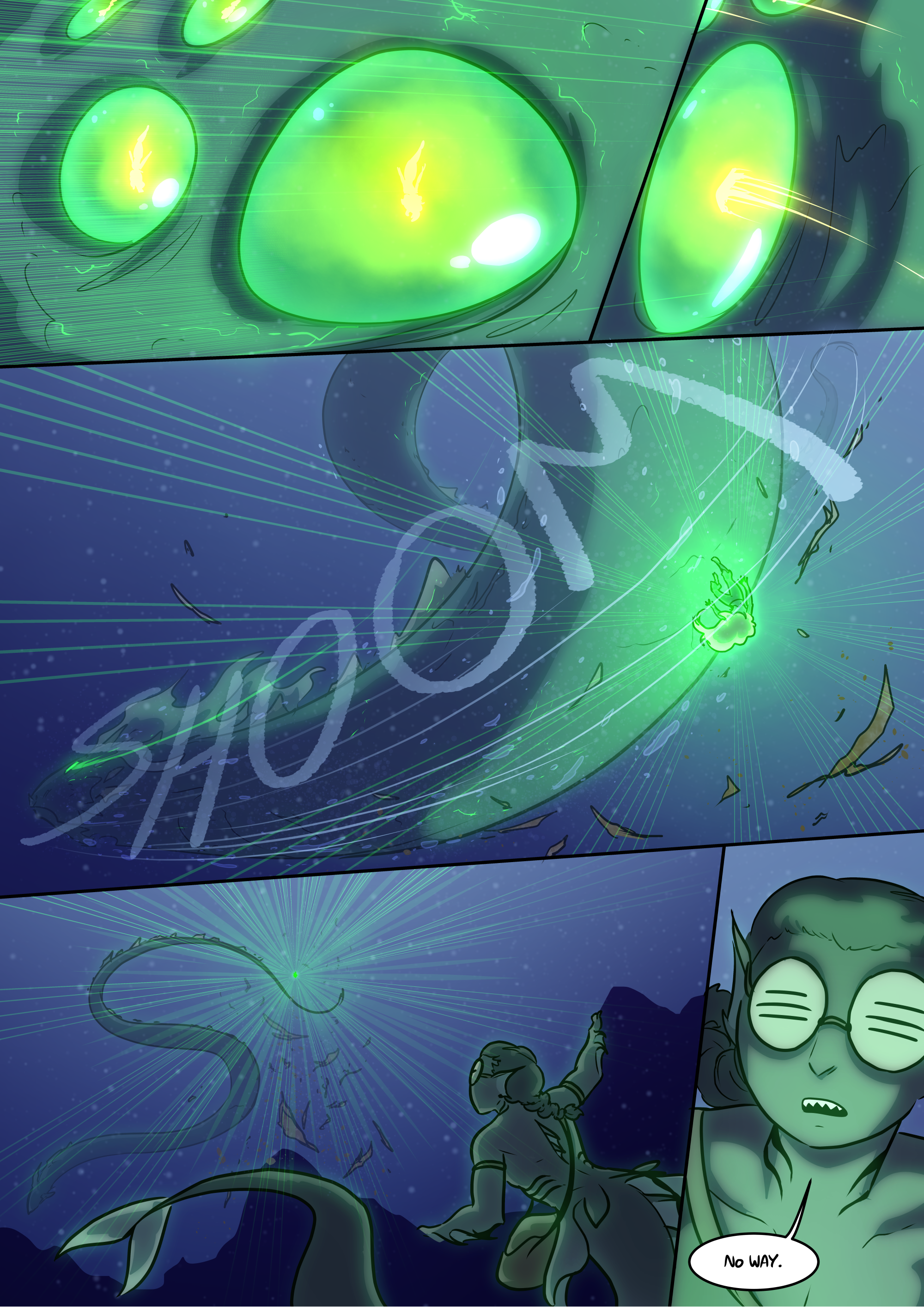 . The serpent’s eyes widen as it beholds glowing Alinua. Then it whips around, quickly zooming away, towards the depths of the ocean.