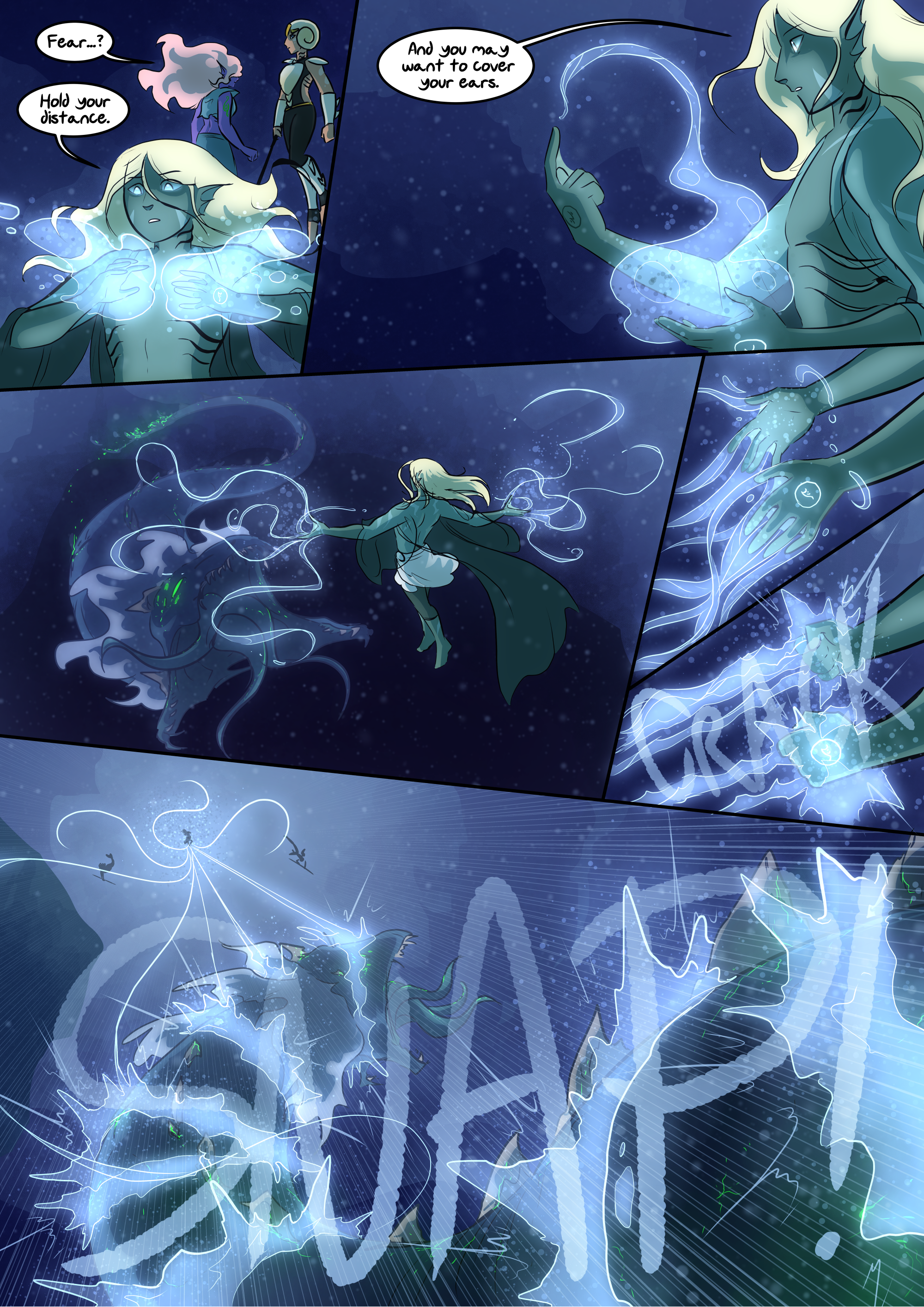 . “Hold your distance,” Caturus says, glowing water lighting up the stripes on his face. He draws a stream out with one finger. “And you may want to cover your ears.”