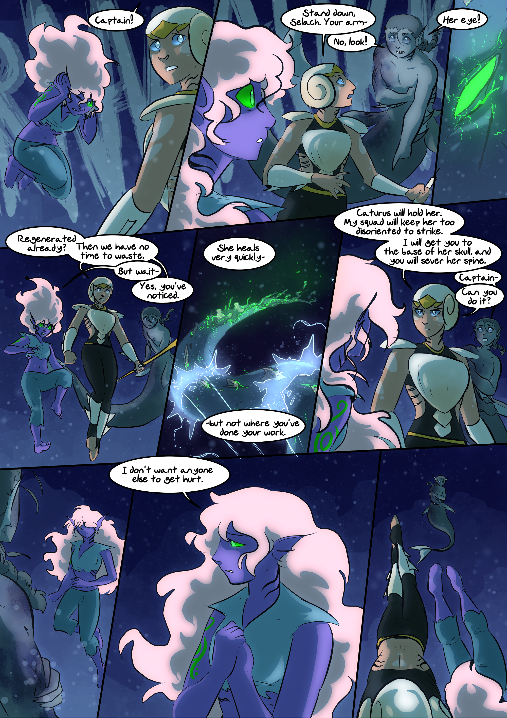 . “Captain!” Valia looks behind her as Selach swims up, injured arm over her stomach.