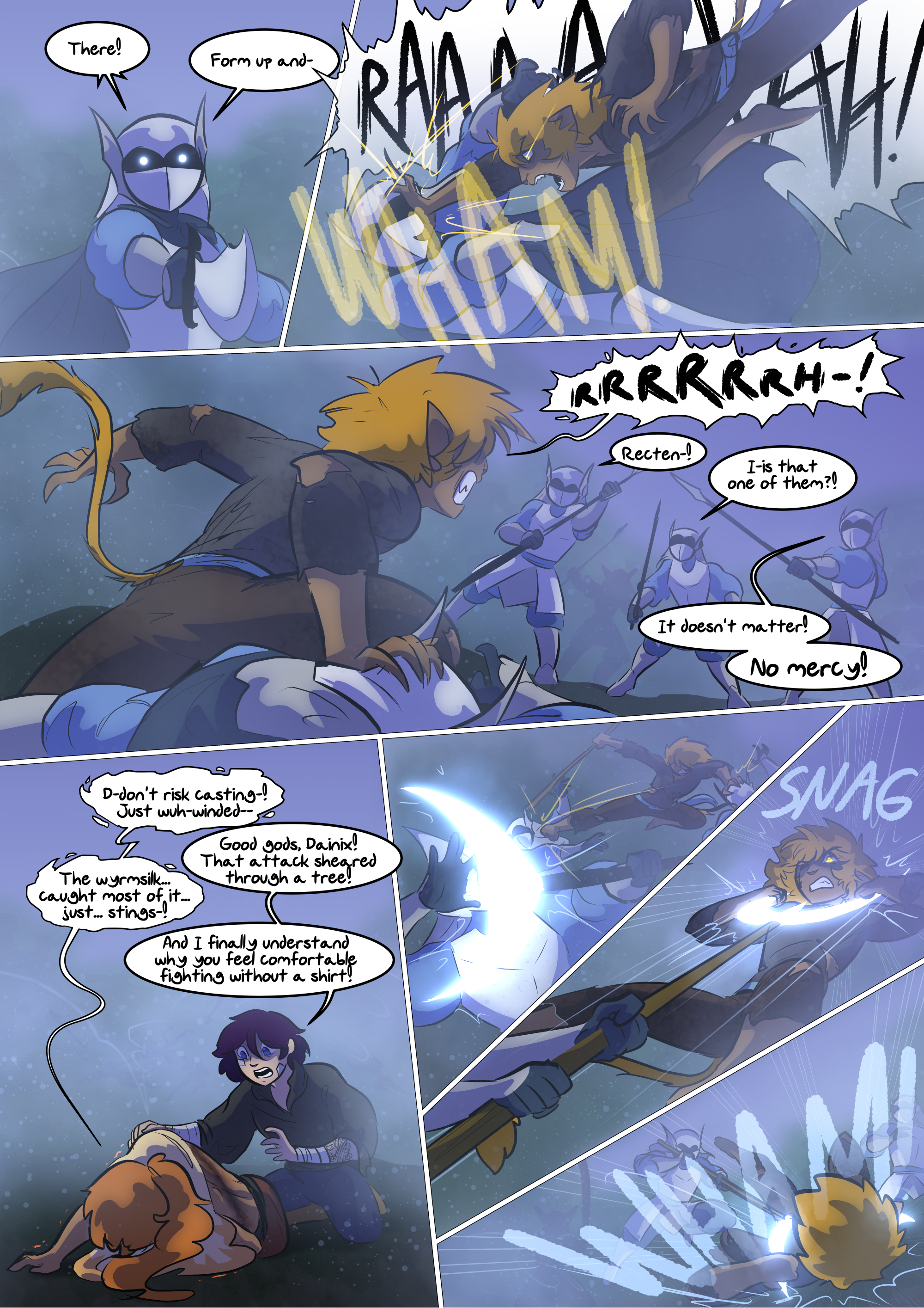 At first, looking at Dainix’s back, I thought it was only bruised⦠but if I zoom in, it does look like the attack actually managed to cut through and break skin, too, which fits Dainix’s note that it stings (versus merely aching). I believe Dainix when he says the wyrmsilk blocked most of it and he’s only winded, i.e. no structural or deep damage like a cut into bone or muscle, but ooooof. He doesn’t have Falst’s healing factor, and they don’t have Life magic to help repair injuries. That’s going to hurt for a while.