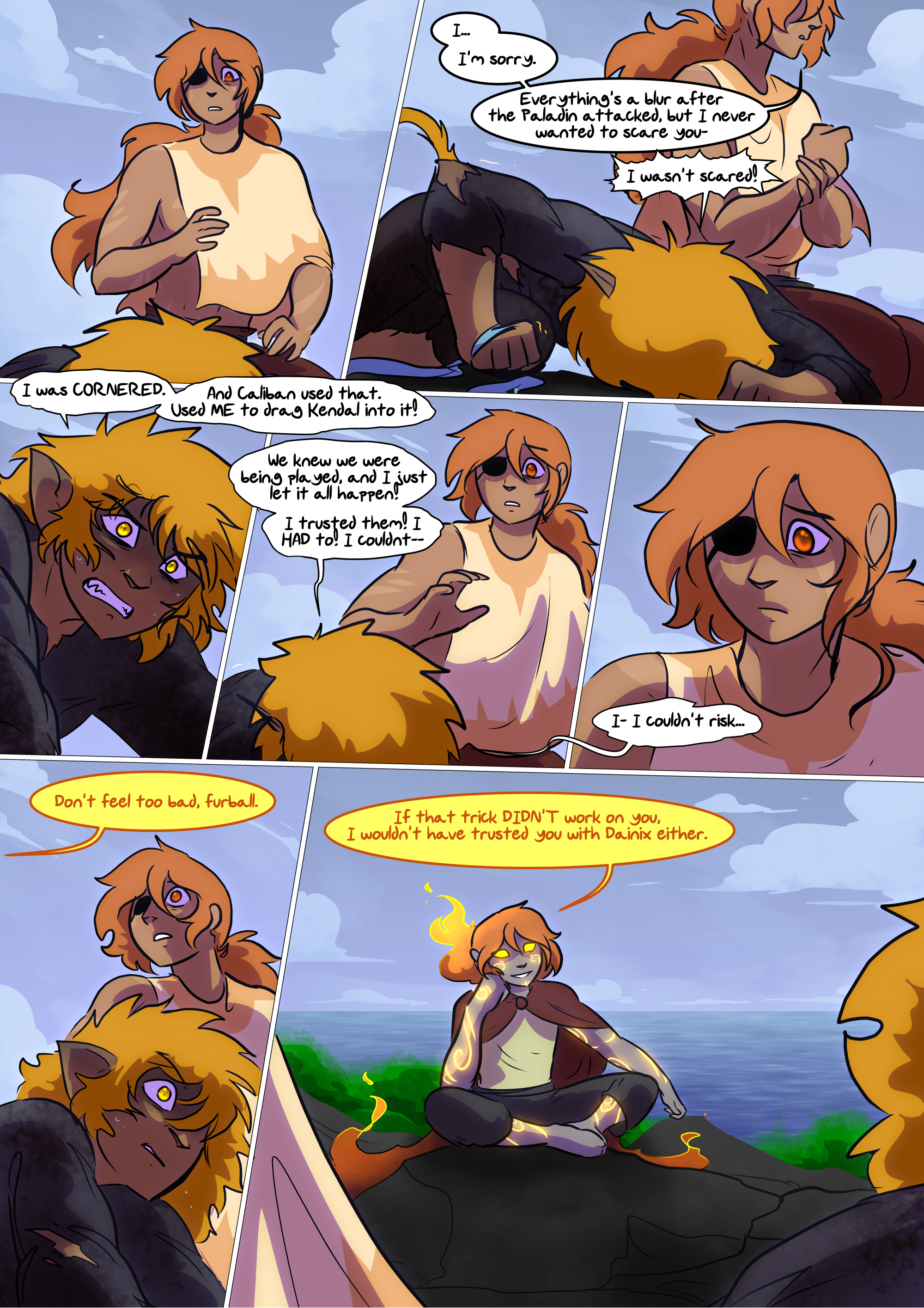. “I wasn’t scared!” Falst bursts out. “I was CORNERED,” he continues raggedly, eyes narrowed in anger, pushing up onto hands and knees. “And Caliban used that. Used ME to drag Kendal into it! We knew we were being played, and I just let it all happen! I trusted them! I HAD to! I couldn’t–” Dainix looks at him, surprised then sad, as Falst continues, “I-I couldn’t risk…”